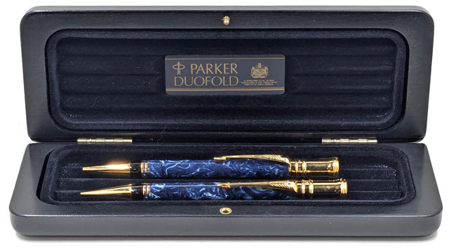 15659: Conklin Ensemble in box: pen-pencil combination, green veined pearl lever-filler, 14.7 cm long, gold filled trim, excellent color preservation in this material that is so prone to discoloration; bold imprints, plating excellent, some light toothmarks visible on cap on close inspection, 1.1 mm lead pencil nozzle has a hairline crack that does not affect function, looks like a scratch, otherwise excellent condition. Noteworthy nib.